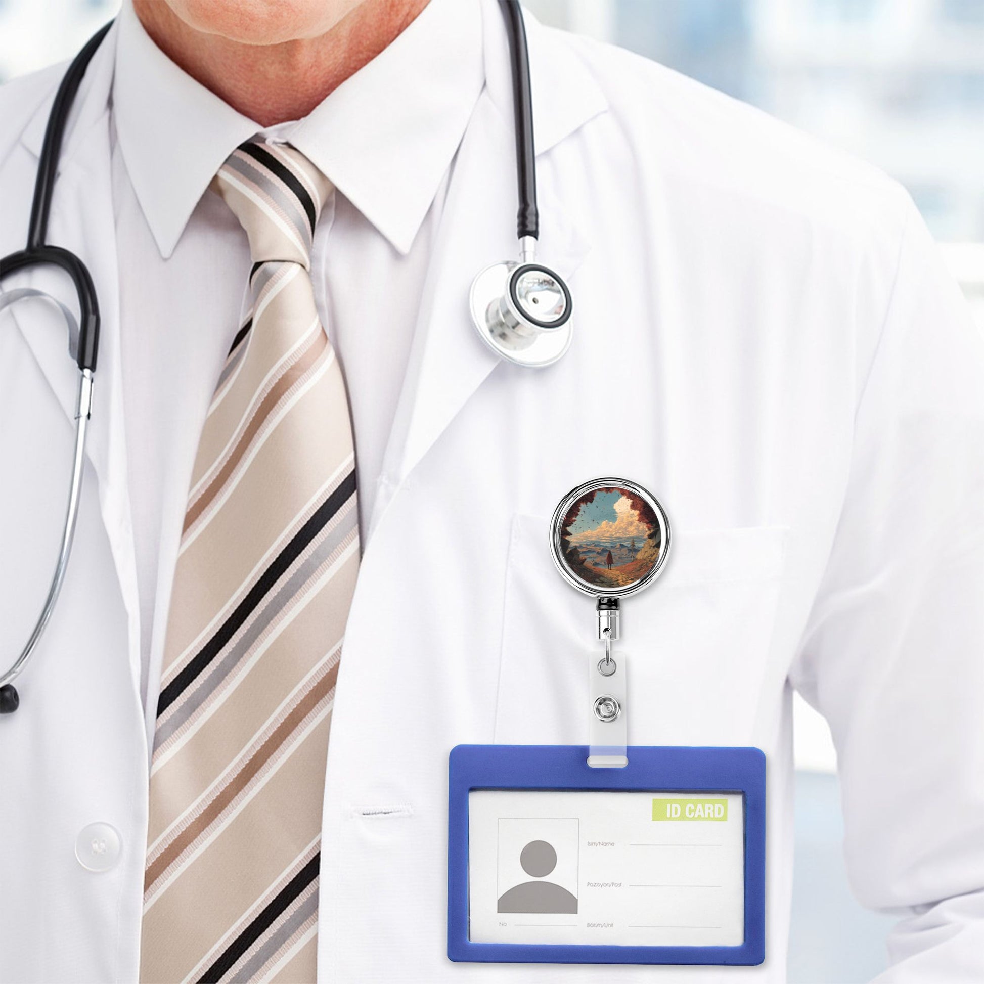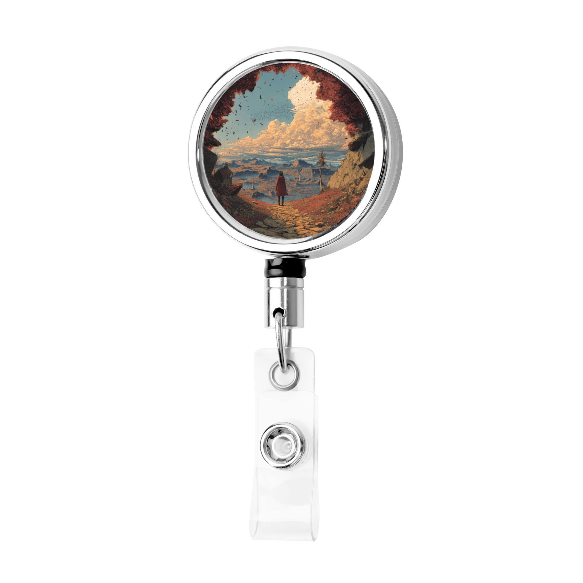 2 - Pack Metal Retractable Full - Size Badge Holders - Scenery Pattern, 360° Rotation, Sturdy and Durable