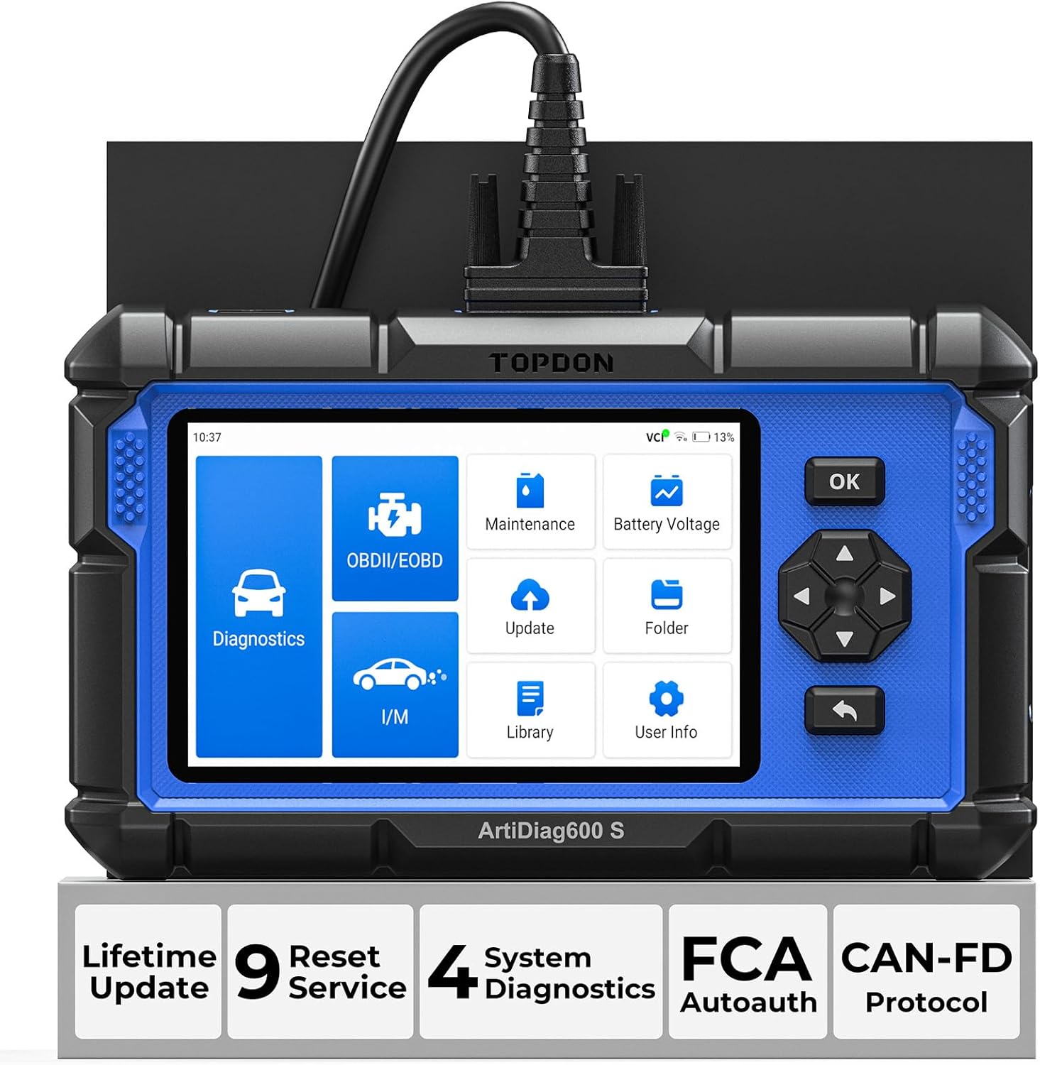 The device's main interface offers comprehensive diagnostic options, including system diagnostics, maintenance services, OBDII/EOBD diagnostics, battery voltage testing, user information management, and file library access. It supports the CAN-FD protocol and FCA automatic certification, and promises lifetime free updates to ensure continuous functional expansion and cutting-edge technology.