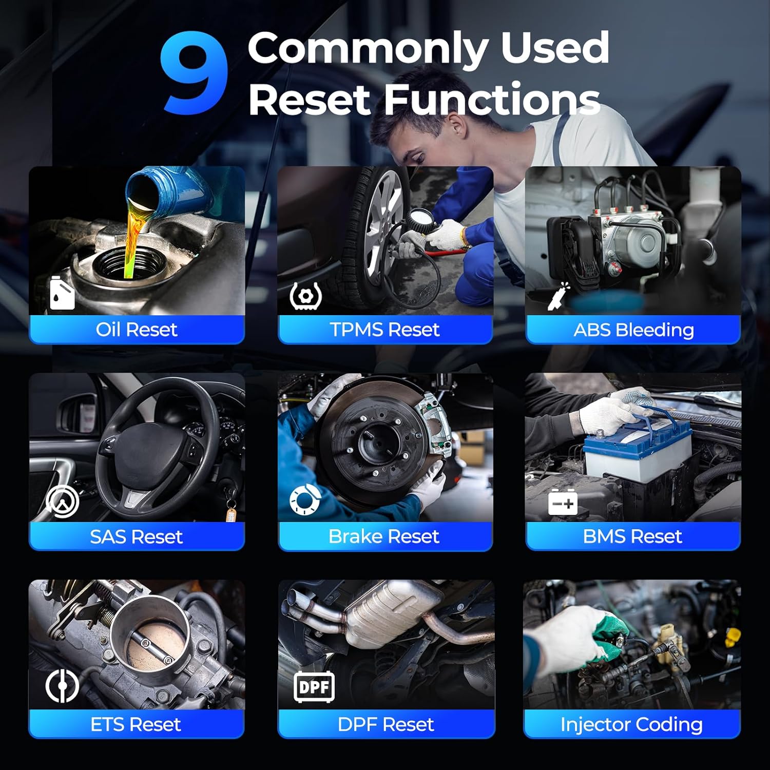 It integrates multiple common vehicle maintenance reset functions, including engine oil reset, tire pressure monitoring system (TPMS) reset, ABS exhaust, steering angle reset, brake system reset, battery management system reset, electronic throttle system reset, diesel particulate filter (DPF) reset and injector coding to meet daily maintenance needs.